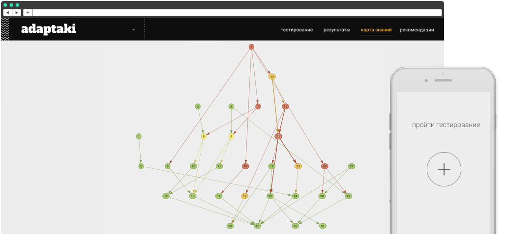 Мы разработали дерево, содержащее предметные знания и навыки. Вершины имеют направленные связи друг другом. Такая сеть позволяет алгоритму анализировать ответы и выдавать последующие задания